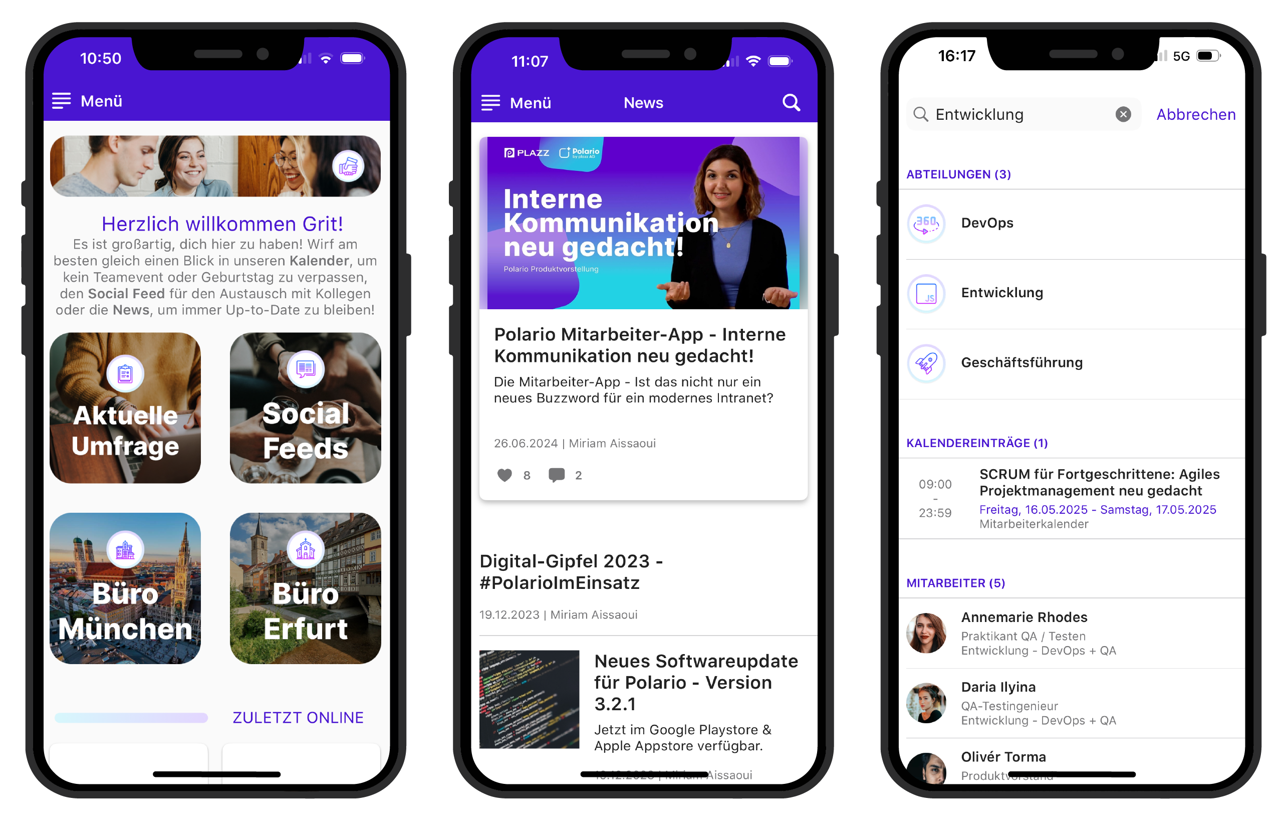 Polario ist eine Mitarbeiter-App, die sich besonders an Unternehmen mit vielen Non-Desk-Workern richtet. Neben einem übersichtlichen Newsbereich bietet sie auch Event-Management-Funktionen und interaktive Elemente wie Chat-Räume, um den Austausch unter Mitarbeitenden zu fördern. Die flexible Gestaltung von Seiten und die einfache Administration machen die App besonders benutzerfreundlich. Unternehmen wie die Magdeburger Verkehrsbetrieb und die Volkswagen Group OTLG setzen bereits auf Polario als Kommunikationslösung.
