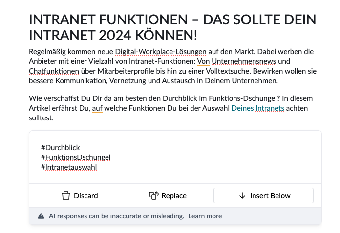 Um herauszufinden, ob die Verwendung von KI-Tools in Verbindung mit dem Intranet in Deinem Unternehmen erlaubt ist, solltest Du Dich zudem am besten auch noch mit Eurer internen Rechtsabteilung austauschen.