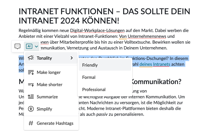 Unternehmen wie Haiilo und Staffbase nutzen bereits KI im Intranet. Haiilo’s KI-Integration AVA unterstützt bei der Erstellung und Anpassung von Texten! So erstellt AVA (Artificial Virtual Assistance) z. B. erste Textentwürfe, wenn Du das Thema vorgibst. Anschließend passt AVA für Dich den Text an. So kann die Tonalität per Mausklick verändert oder der Text kann gekürzt oder ausgeschmückt werden. Ebenso können Texte durch die KI inhaltlich vereinfacht oder zusammengefasst werden. Zu guter Letzt sucht AVA dann noch die zum Text passenden Hashtags für Dich heraus! Darüber hinaus kann AVA Dich bei der Informationssuche im Haiilo-Intranet unterstützen. Nachdem Du ihr eine einfache Frage gestellt hast („Wo kann ich meine Arbeitszeit erfassen?“) durchsucht AVA dann Dein Intranet für Dich und beantwortet Dir die Frage, ohne dass Du Dokumente oder Seiten nach der richtigen Info durchwühlen musst!