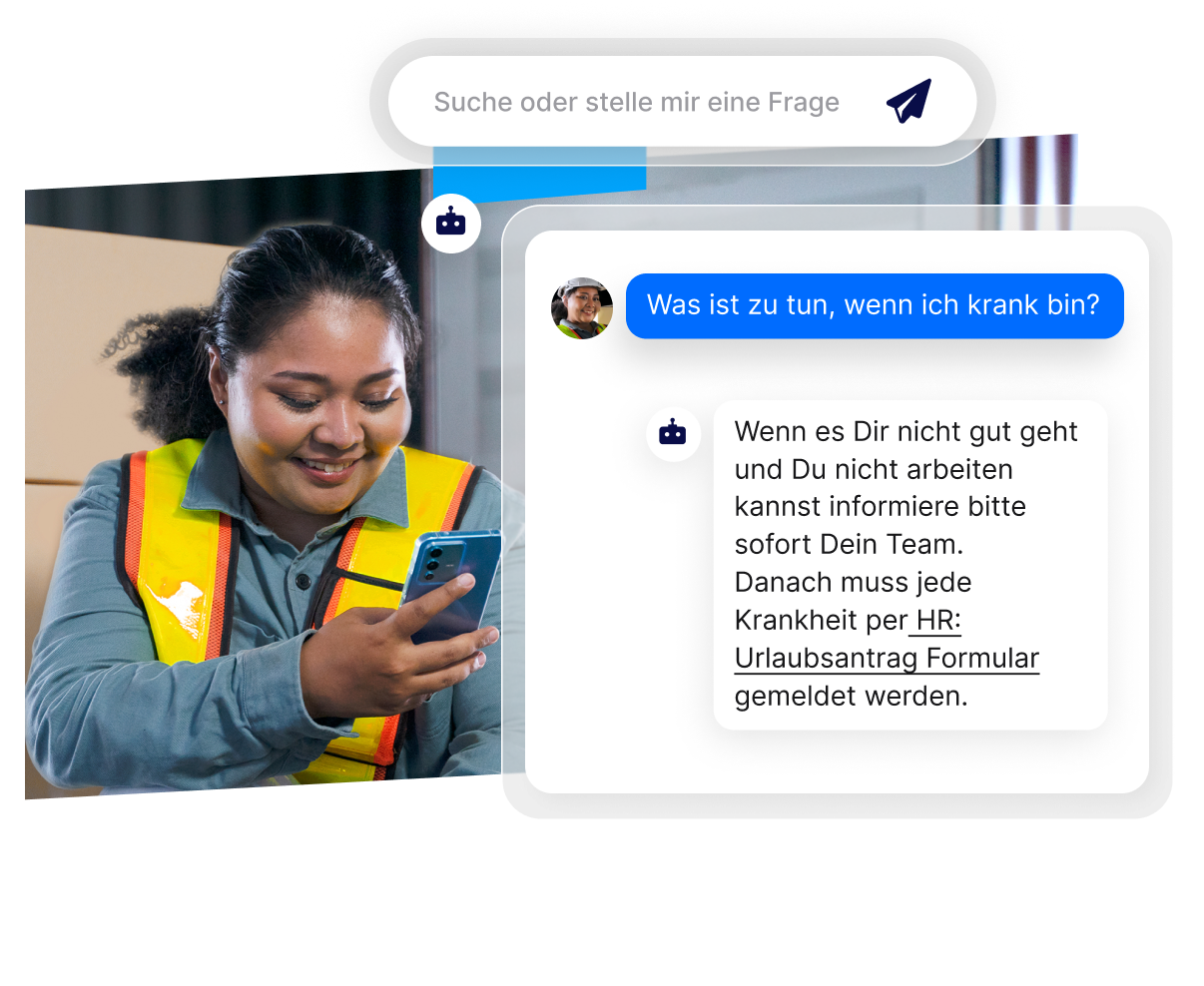 Zudem kann die Zugänglichkeit zu unternehmensinternen Services und Prozessen verbessert werden. So könnte ein KI-betriebener Chatbot z. B. aufkommende Fragen der Belegschaft beantworten, wie: „Wo mache ich meine Zeitschreibung?“. Darüber hinaus kann die KI Workflows effizient ausführen, beispielsweise bei der Anfrage nach Urlaub: „Ich möchte vom 8.2. bis zum 14.2. Urlaub buchen.“. Auch im Bereich der vertieften Informationssuche kann die KI im Intranet eine Hilfestellung sein. Informationen werden nicht nur leichter zugänglich gemacht, sondern auch in Bezug zueinander gesetzt. Dadurch werden unterschiedliche Fachkenntnisse miteinander verbunden und Synergien können effektiv genutzt werden.