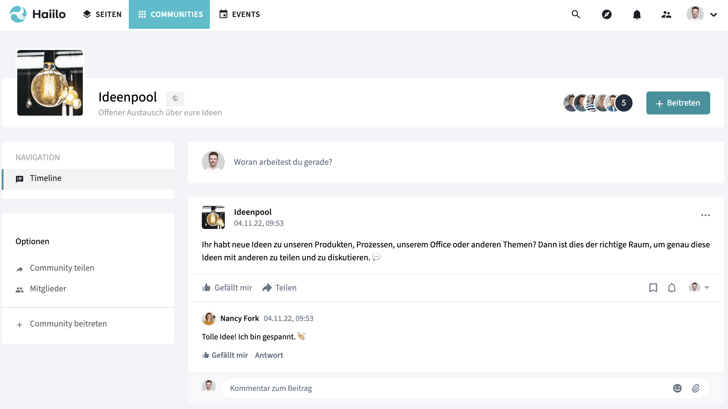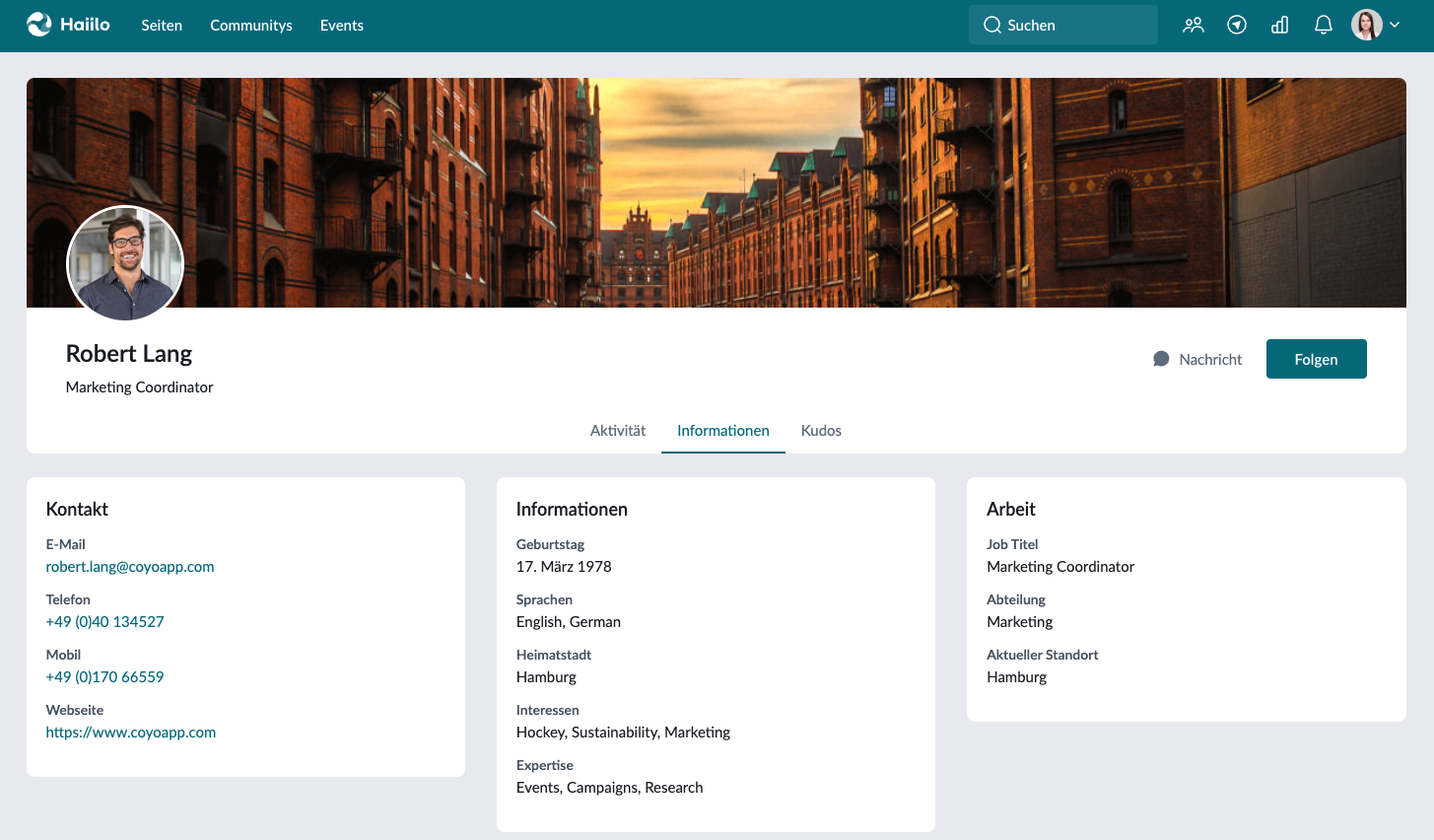 Austausch und Vernetzung findet in Unternehmen längst nicht mehr nur abteilungs- oder team­intern statt. Ein Social Intranet unterstützt dabei die unternehmens­übergreifende Ver­netzung zu fördern. Durch ein Mitarbeiter­verzeichnis können sich interessierte Kolleginnen und Kollegen z. B. über die Expertise anderer informieren und diesen auch folgen. Darüber hinaus bietet das Social Intranet mit Communitys eine Möglich­keit zum interessen­basierten Aus­tausch, wie wir es hier bei Haiilo sehen. So können sich Mitarbeitende in der Lauf­gruppe zum Joggen am Wochen­ende verabreden, in der Mitfahr­zentrale für den gemeinsamen Arbeits­weg verabreden und im Ideen­pool neue unter­nehmens­übergreifende Vorschläge sammeln. Zudem bieten manche mo­der­ne Social Intranets schon heute KI-gestützte Empfehlungssysteme, die automatisch passende Inhalte, Gruppen oder Kollegen vorschlagen – basierend auf Interessen, Abteilung oder bisherigen Aktivitäten.