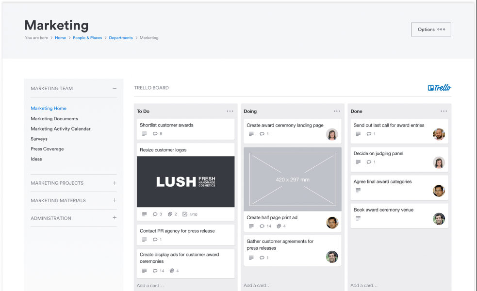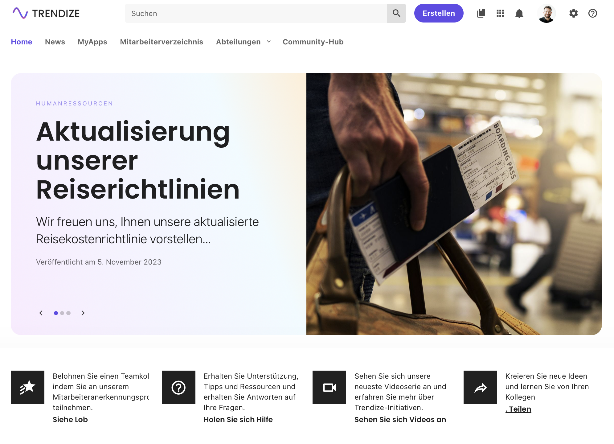 Social Intranets haben umfassende Möglichkeiten zur Personalisierung von Inhalten für den Mittelstand. Interne Kommunikatoren können dadurch ihre Botschaften auf Basis von z. B. Abteilungen oder Standorten zielgerichtet verteilen. Anders als bei E-Mails dürfen Mitarbeitende hierbei selbst ent­scheiden, welche News sie neben verpflichtenden Informationen noch erhalten möchten. So steigt auch die Relevanz der Inhalte für jeden Mit­arbeitenden deutlich. Viele Systeme bieten inzwischen interaktive Formate wie Umfragen, Reaktionen und Kom­mentarfunktionen direkt im Newsfeed, was das Engagement spürbar erhöht. Auf der Startseite können dann die wichtigsten Neuigkeiten gebündelt dargestellt werden, wie wir es hier bei LumApps sehen können.