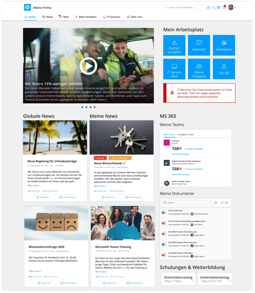 Beide Lösungen bieten Dir eine gute Microsoft 365- und Google Workspace-Integration. Durch die Integration können Events, die im Intranet erstellt werden und bei denen eine Zusage stattfindet, direkt mit dem eigenen Outlook-Kalender synchronisiert werden. Staffbase bietet hier sogar konkrete Microsoft 365-Widgets, unter denen sich auch ein Kalender-Widget befindet. So können Nutzende den jeweils für sie konfigurierten Microsoft-Kalender sehen. Direkt über das Widget können Nutzende dann auch Links zu Online-Besprechungen aufrufen und daran teilnehmen.